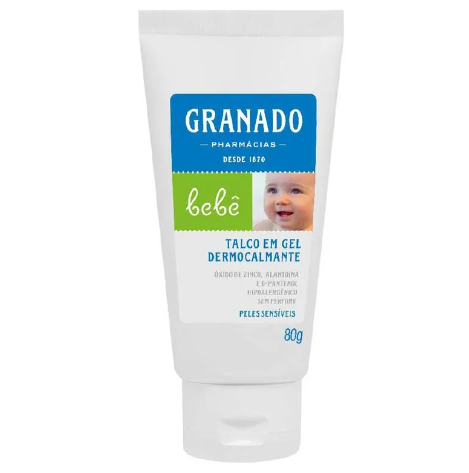 O Talco em Gel Dermocalmante para Bebê, da Granado, Mantém a pele seca e protegida. Previne e alivia coceiras, brotoejas e assaduras. Oferece conforto imediado. Formulado com ceramidas, alantoína, D-pantenol, squalane, óxido de zinco e proteínas do trigo, da aveia e amêndoa doce. Desenvolvido especialmente para atender às necessidades de peles sensíveis, inclusive de recém-nascidos. Hipoalergênico. Dermatoloigcamente testado. Livre de parabenos, corantes, perfume, óleo mineral, silicones, álcool etílico e ingredientes de origem animal.